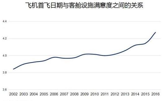 上圖是飛機(jī)首飛日期與客艙設(shè)施滿意度之間的關(guān)系,可以看出首飛日期越近滿意度越高,首飛日期越早滿意度越低,而且是持續(xù)地降低。“也就是說我們?nèi)说男枨笤谧兓?,我們得跟上人的需求變化。行業(yè)的標(biāo)準(zhǔn)是持續(xù)的在升級的,我們需要往前追趕?!?